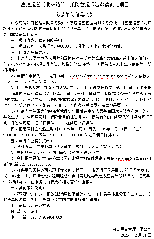 高速运管(北环路段)采购营运保险邀请询比项目邀请单位征集通知